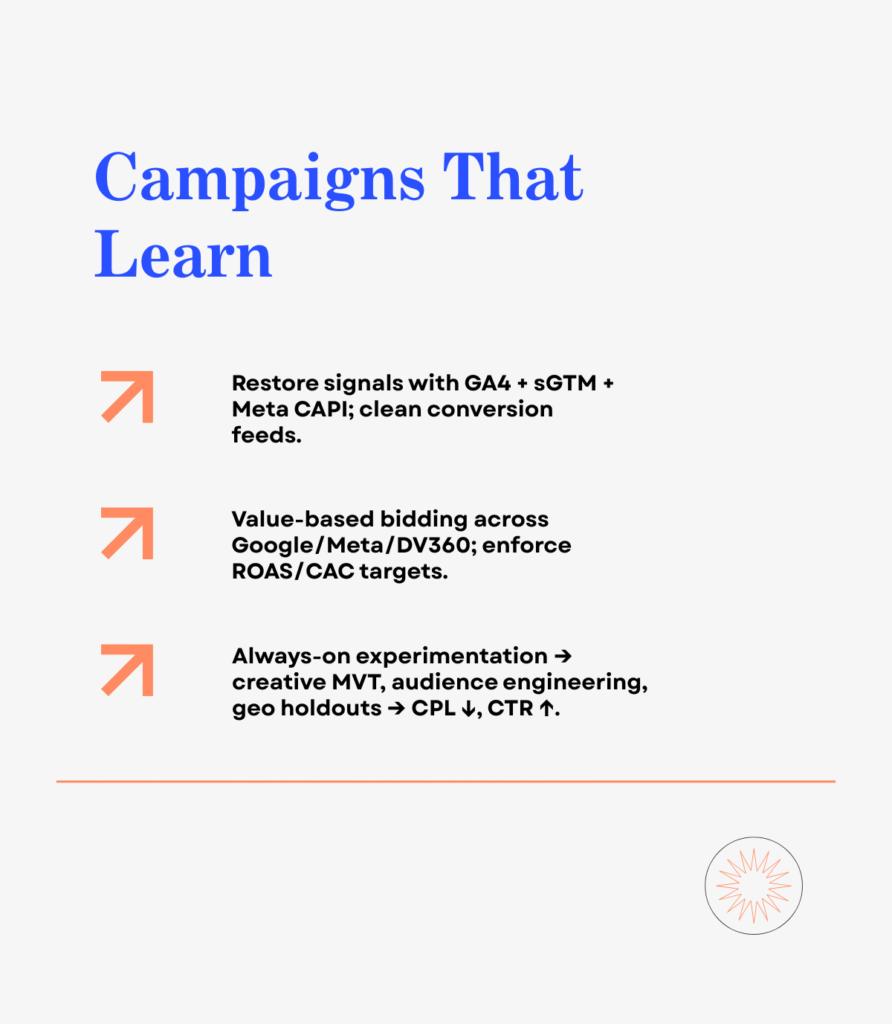 We integrate analytics with Google, Meta, SEO, and DV360 to ensure budgets move towards high-performing channels.